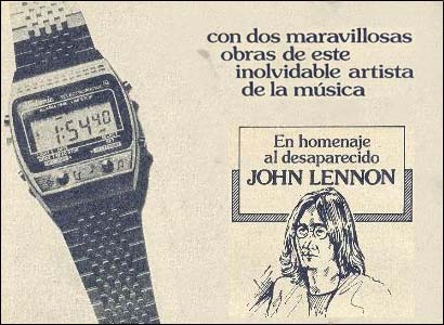 “Un reloj electrónico de cuarzo provisto de avisador musical con las dos más famosas melodías de las que fue autor este compositor y cantante. Por solo 3.900 pesetas un extraordinario reloj cronómetro Alfatronic de cuarzo con la música de John Lennon”.