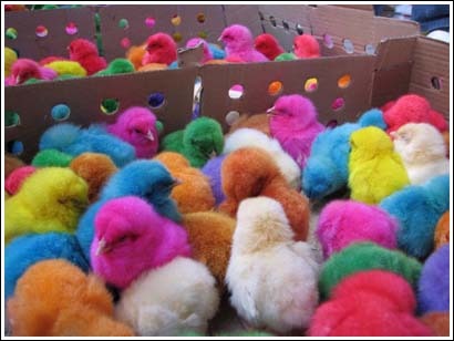 Hoy en día tendo a los pollitos de colores en mente, pero reconozco que cuando se es niño no se piensa en las crueldades que se hacen con los animales, hoy considero que pintar a estos pequeños y simpáticos animales es una atrocidad.