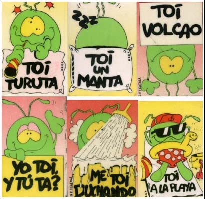 Toi aburrio, toi namorao, toi del reves o no toi, eran algunas de las expresiones que una especie de bola verde con ojos y brazos decía en muchas de las pegatinas que salían con este producto y que muchos llegamos a tener verdaderas colecciones que intercambiábamos como locos en los recreos de clase y que tan orgullosos llevábamos en nuestras carpetas.