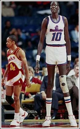 Uh, el pie de foto está equivocado. El bajito no es Muggsy Bogues, sino Spud Webb, otro ilustre bajito y campeón de mates de la NBA. Bogues y Bol jugaron juntos en los Bullets.