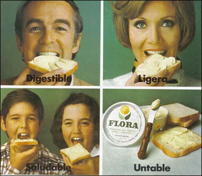 “Porque FLORA es salud. Así, como suena: pura salud. Salud para toda la familia. ¿Y sabe por qué? Porque FLORA es una margarina hecha exclusivamente de aceites vegetales seleccionados. Exclusivamente”.