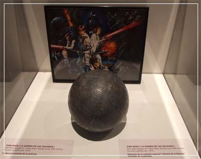 Cartel firmado por los protagonistas de Star Wars y una de las maquetas de la Estrella de la Muerte usadas en la película