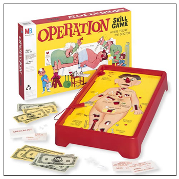 ¿Os acordáis de “Operación”? Era un juego en el que nos metíamos en el papel de un doctor y debíamos extirpar diferentes órganos y huesos a un paciente sobre una pequeña mesa sin tocar nada más que lo que íbamos a extraer, de lo contrario la pinza al hacer contacto con el metal haría que la luz roja que el paciente tenía por nariz se iluminase y perdieses el turno.