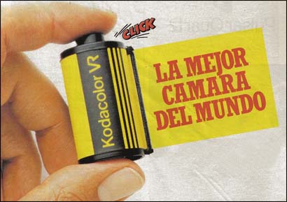 “400º ISO. Muy rápida. Ideal para fotografía deportiva y también de acción. 1000º ISO. Las fotos imposibles hechas posibles gracias a su enorme sensibilidad. La creatividad sin límites. Películas Kodacolor VR. Mejoran tu cámara”.
